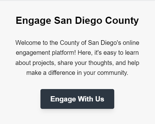 Our new Engage San Diego County online tool is a Community Engagement “hub” where interested citizens can become aware, informed, and engaged on a wide variety of projects and programs. Opportunities include everything from forums to surveys, spaces to give ideas and feedback, FAQs, project information, and polls. People can register to get notifications and updates, allowing residents to engage when it is most convenient for them on the topics they care about.