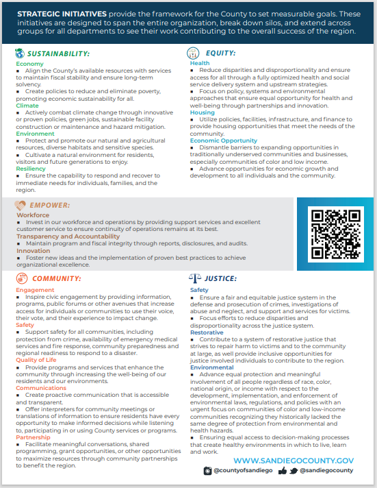 The Strategic Plan is the what of our enterprise. In its refreshed state, it lays out the overarching initiatives for the County. The incredible variety of services we provide all feed up into these common themes: sustainability, equity, empower, community, justice. Each of these breaks down into more specific areas of activities where our diverse County duties and individual and collaborative work of our employees are reflected. The continuing work we do with Live Well San Diego is also woven into these themes.