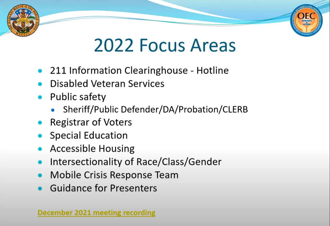 • OEC assisted in filling five of six vacant seats on the eleven-person committee, establishing priorities and focus areas, and executing an action plan for the committee to increase its familiarity with operations, and provide input on accessibility to key departments within the County of San Diego.