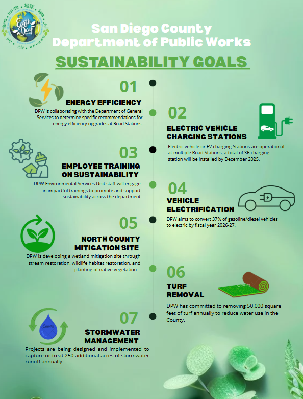 The County of San Diego’s Office of Sustainability and Environmental Justice (OSEJ) asks each department to identify and work toward at least five sustainability goals. These include three short-term goals (to be completed within a year), one mid-term goal (to be completed within one to three years), and one long-term goal (taking more than three years to complete). The Department of Public Works (DPW) Environmental Services Unit is responsible for tracking and development of the DPW’s sustainability commitments.