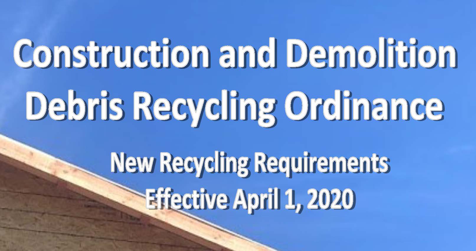 Construction and demolition projects must recycle, reuse, or donate 65% of all materials, including 90% of inerts (concrete, asphalt, dirt, etc.).