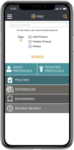 The EMS Mobile App is a browser-based application and works on any device with an internet connection and web browser. The app allows users to easily search through all protocols and policies using keywords. In addition, users can bookmark specific protocols and policies to quickly access them at any time.
