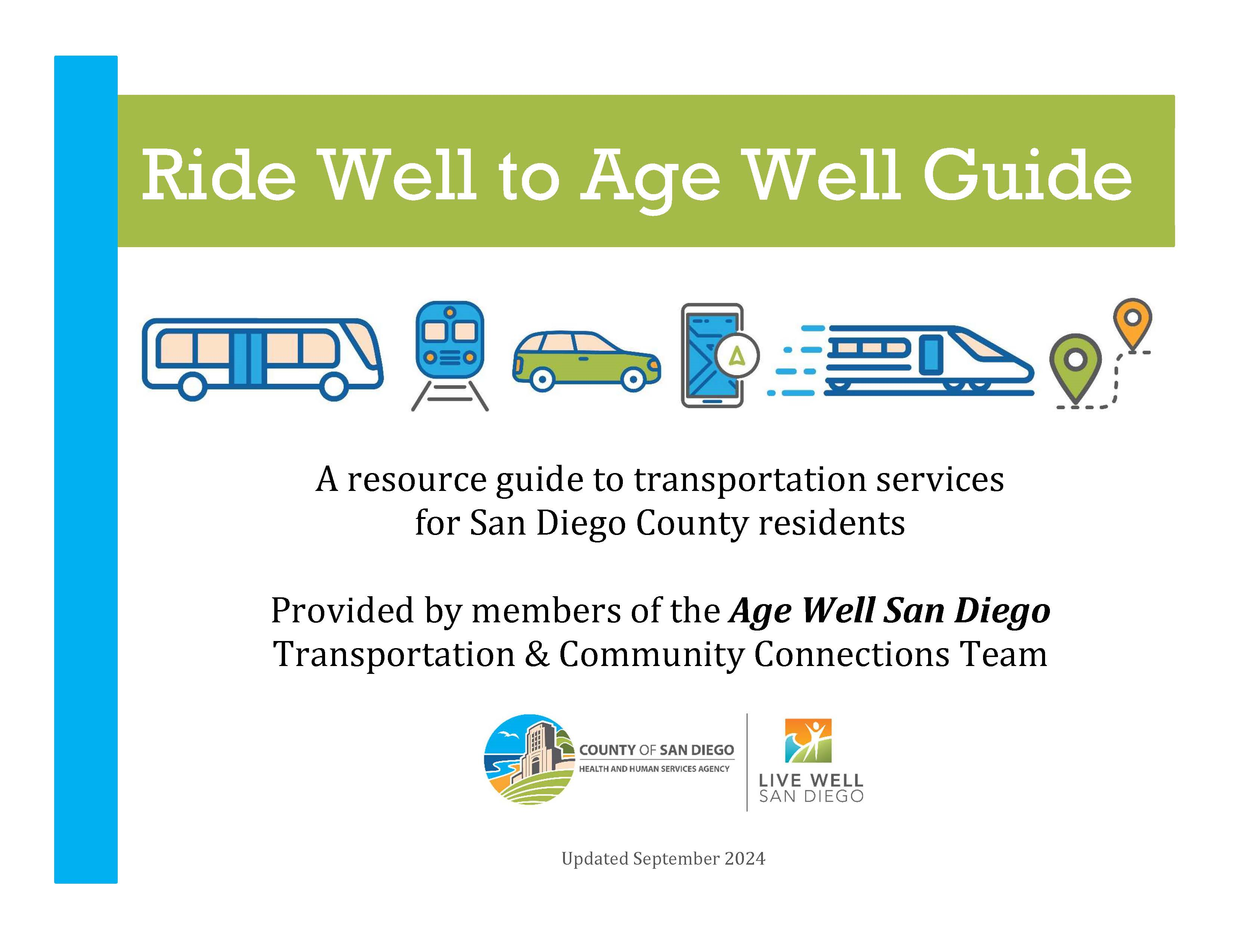 The Age Well Transportation & Community Connections Team created the Ride Well to Age Well Guide as a way to catalog transportation options throughout San Diego County by region. The guide also explains how to download and use mobile applications such as Lyft, and provides a glossary of common transportation terms.