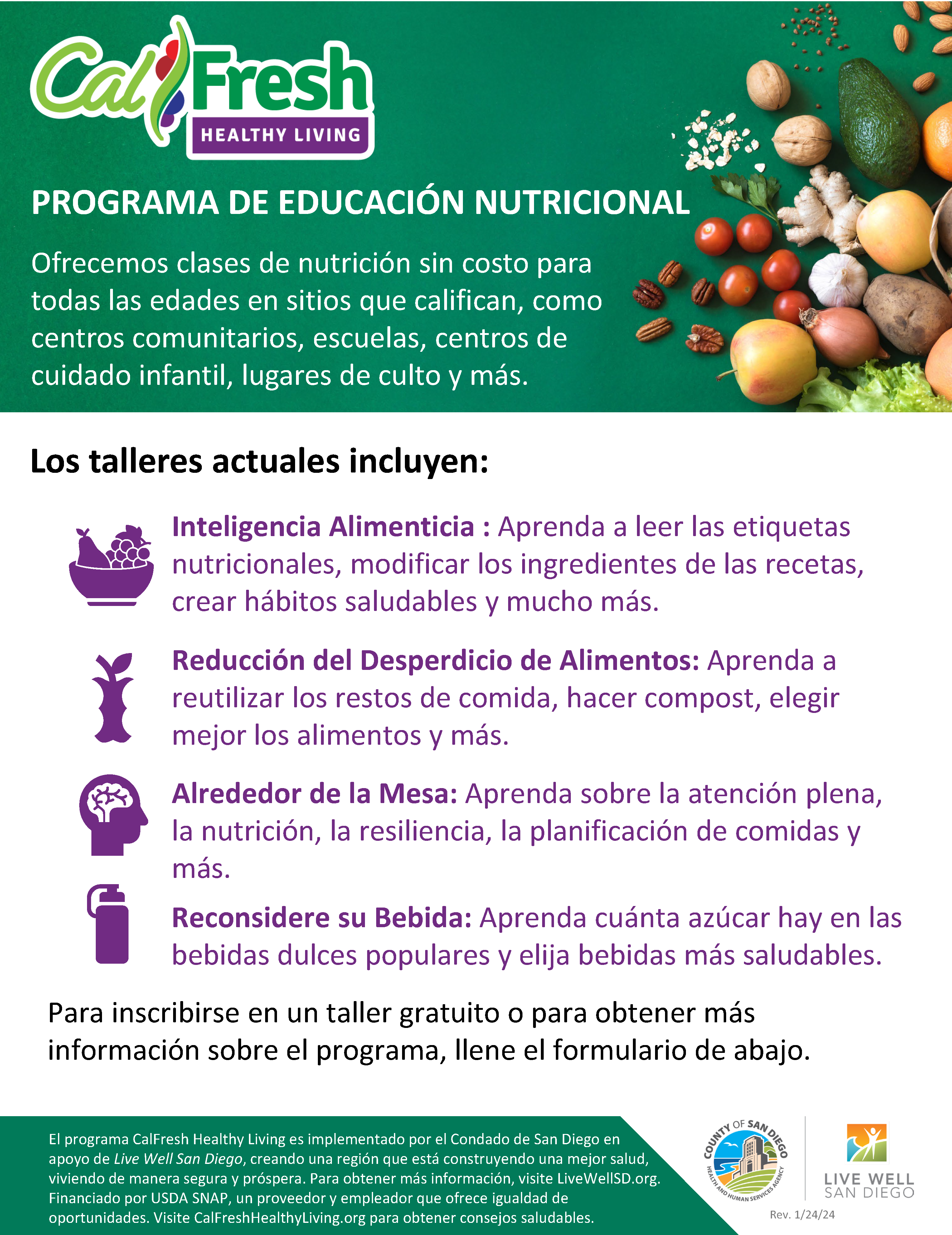 The CalFresh Healthy Living program is implemented by the County of San Diego in support of the Live Well San Diego vision for healthy, safe, and thriving communities. For more information about the vision, visit LiveWellSD.org. Funded by USDA’s Supplemental Nutrition Assistance Program-SNAP. This institution is an equal opportunity provider. Visit CalFreshHealthyLiving.org for healthy tips.