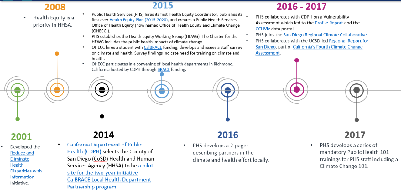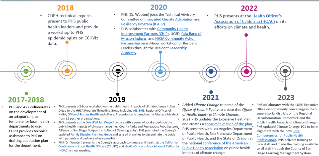 The County of San Diego Strategic Plan provides a framework for the County to set measurable goals. The County has prioritized climate, resiliency, health equity, environmental justice, safety, and community engagement. PHS Climate Change and Health efforts support these strategic priorities, aim to break down silos, and connect different organizations within the County leading on these priority areas.