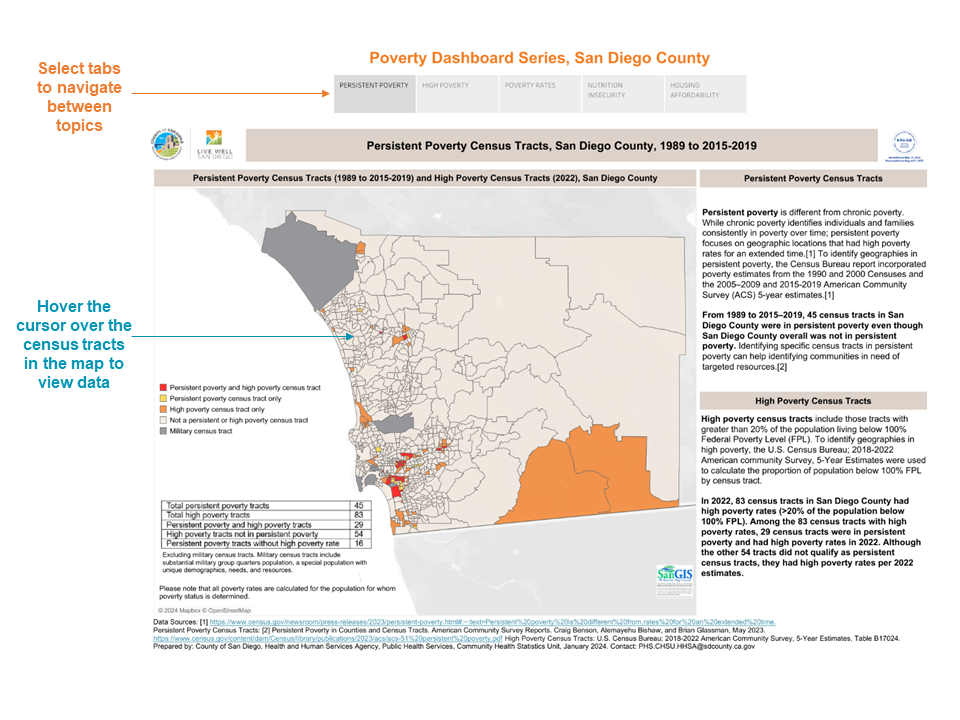 The Socioeconomic Disparities in San Diego County Dashboard displays interactive maps of Qualified Census Tracts, the percentage of the population under 200% of the federal poverty level (FPL) by census tracts, and Difficult Development Areas by zip code tabulation area.