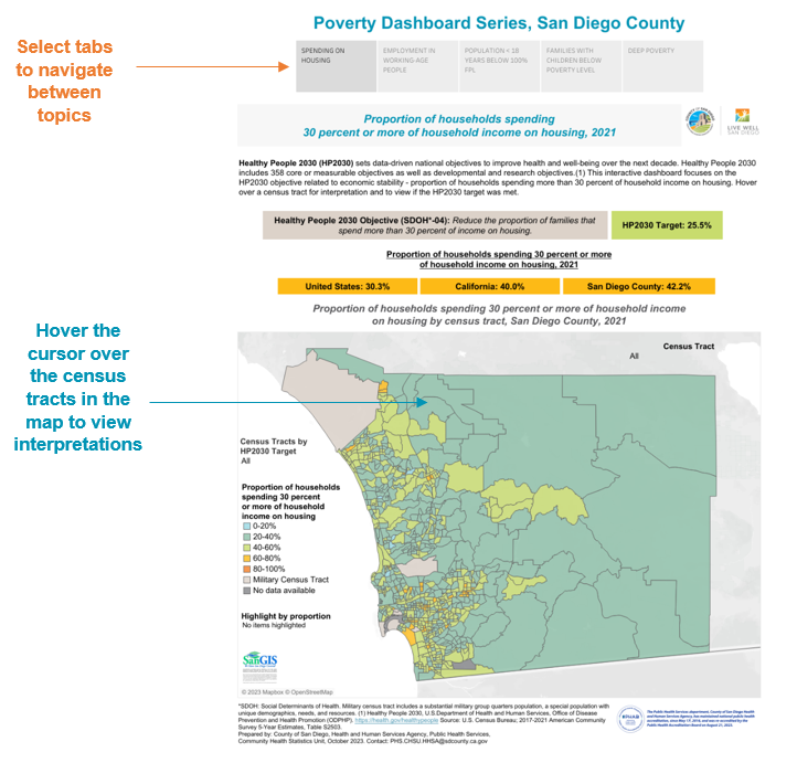 See the below images to learn how to use the San Diego County Self-Sufficiency Standard Dashboard: