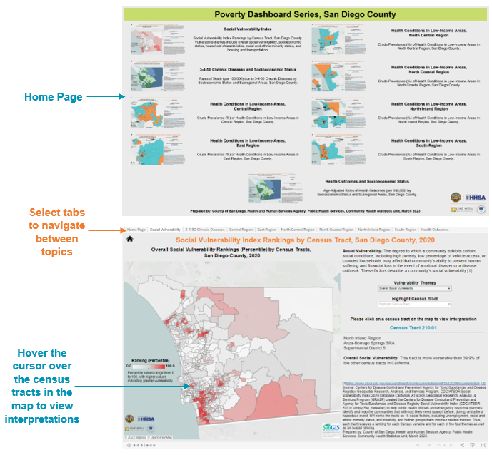 This interactive tool helps to highlight the areas of concentrated poverty, low housing affordability, and areas with low access to food. Hover over an area on each map to view the census tract name, Health and Human Services Agency (HHSA) Region, Subregional Area (SRA), and the Supervisorial District to which it belongs.