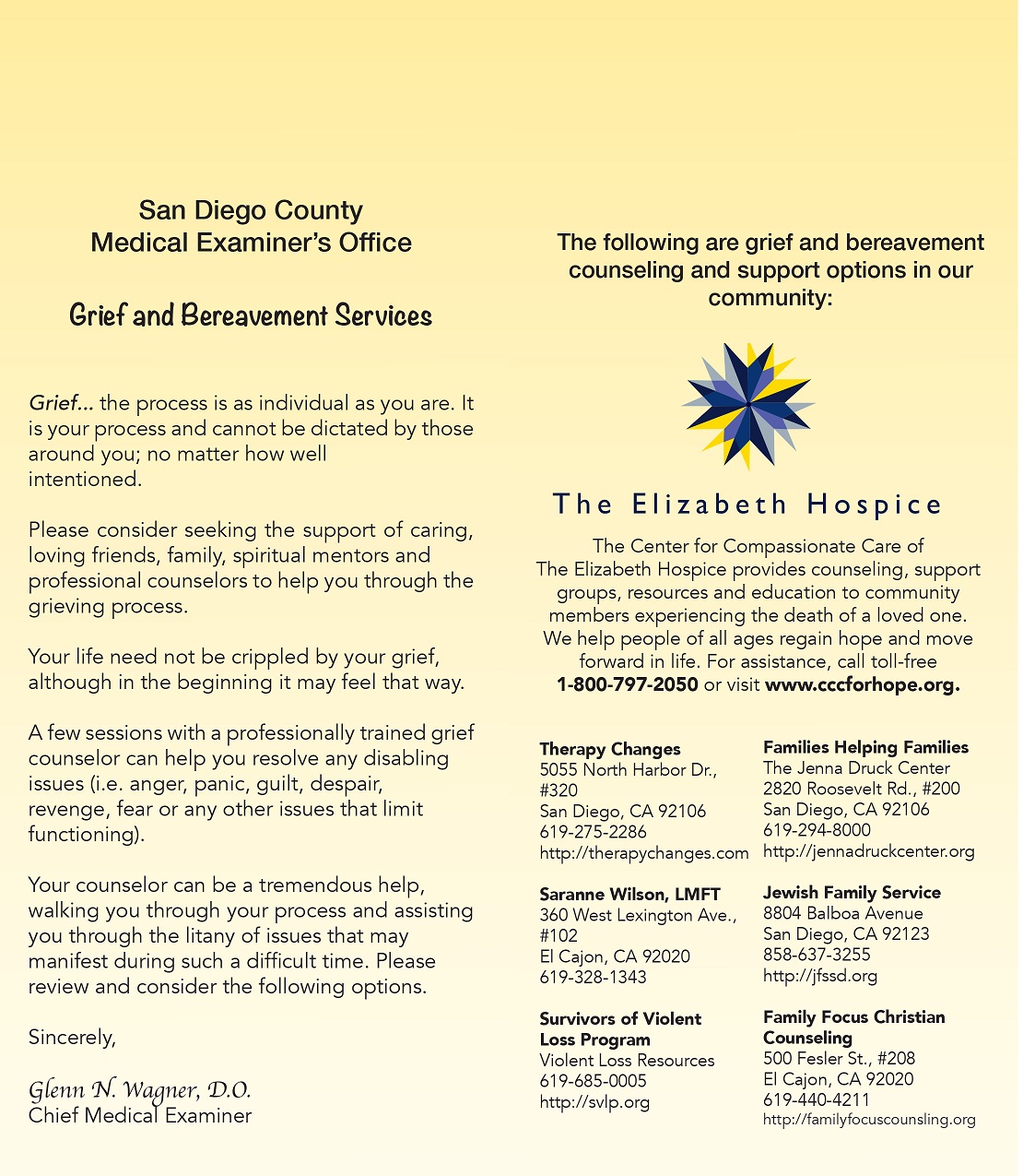 The San Diego County Medical Examiner Bereavement Center partners with The Center for Compassionate Care of the Elizabeth Hospice in order to be a support to those that have experienced a sudden and traumatic death in the family and provides free services such as licensed counseling, financial and credit counseling and credit services.  We also refer services for Crime Victims Compensation, various survivor support programs for homicide, sudden infant death, suicide and general bereavement.