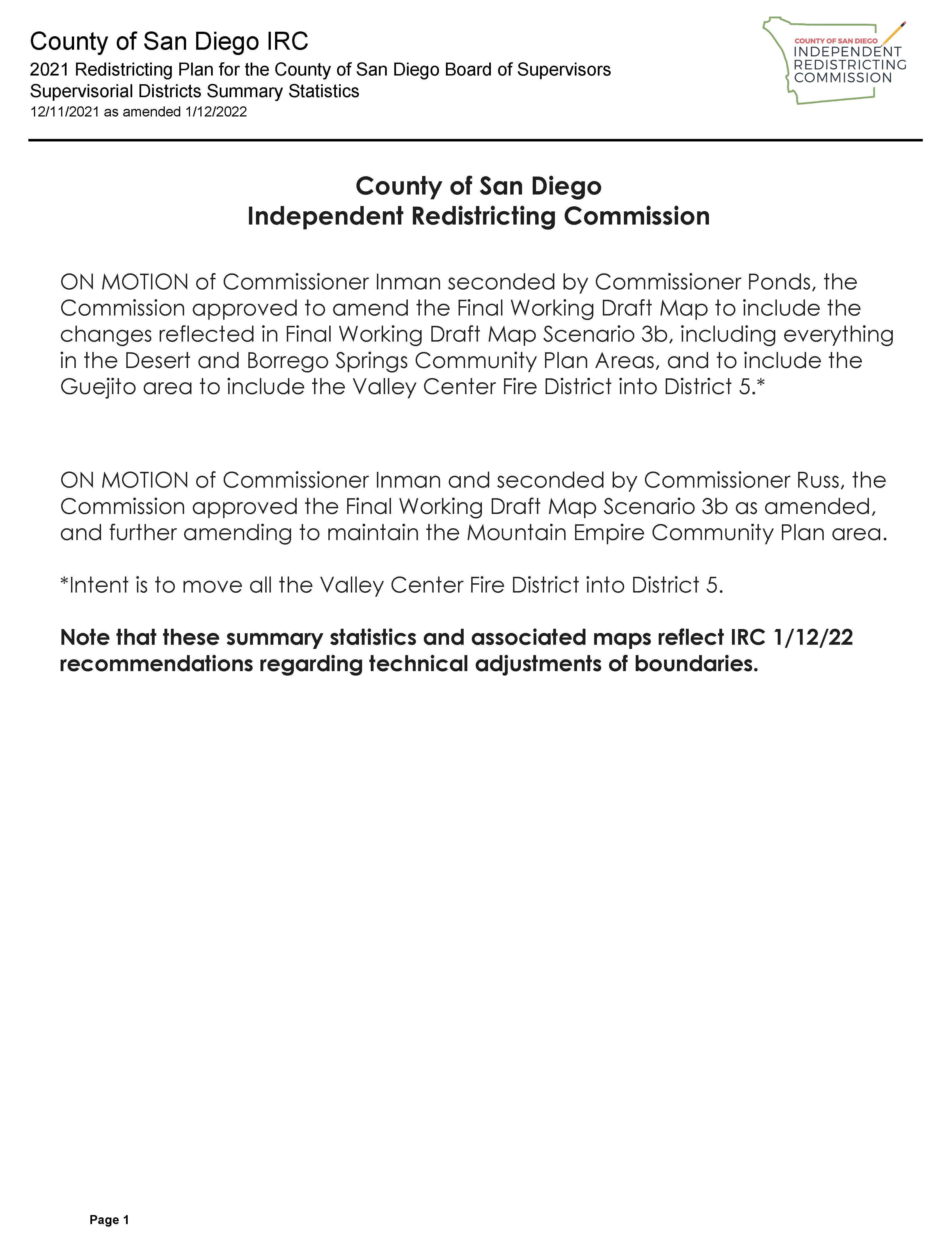 On January 12, 2022, the IRC approved technical changes to the 2021 Redistricting Plan and Final Report adjusting boundaries of the supervisorial districts of the County of San Diego Board of Supervisors.