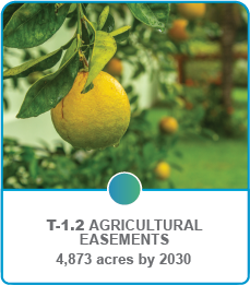 The County’s Climate Action Plan, adopted in 2018, includes a measure that sets a specific target for annual agricultural easements. Climate Action Plan Measure T-1.2 aims to acquire 443 acres of agricultural easements annually with estimated carbon savings from preventing 18 dwelling units. As of 2018, the County placed 793 acres in agricultural easements, at an average cost of $2,859 per acre, well beyond the 2020 Climate Action Plan target.