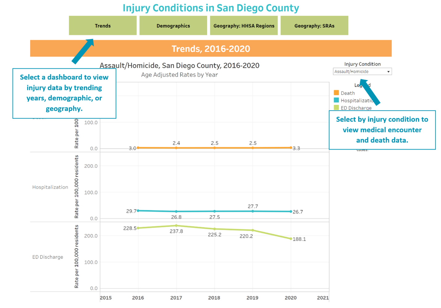The 2020 Injury Report and Dashboard present information about injury-related conditions among residents living in San Diego County. The information presented includes injury indicators annual age-adjusted rates across years, crude rates by demographics (age, sex, and race/ethnicity), and by subregional areas (SRAs) and Health and Human Services Agency (HHSA) Regions.