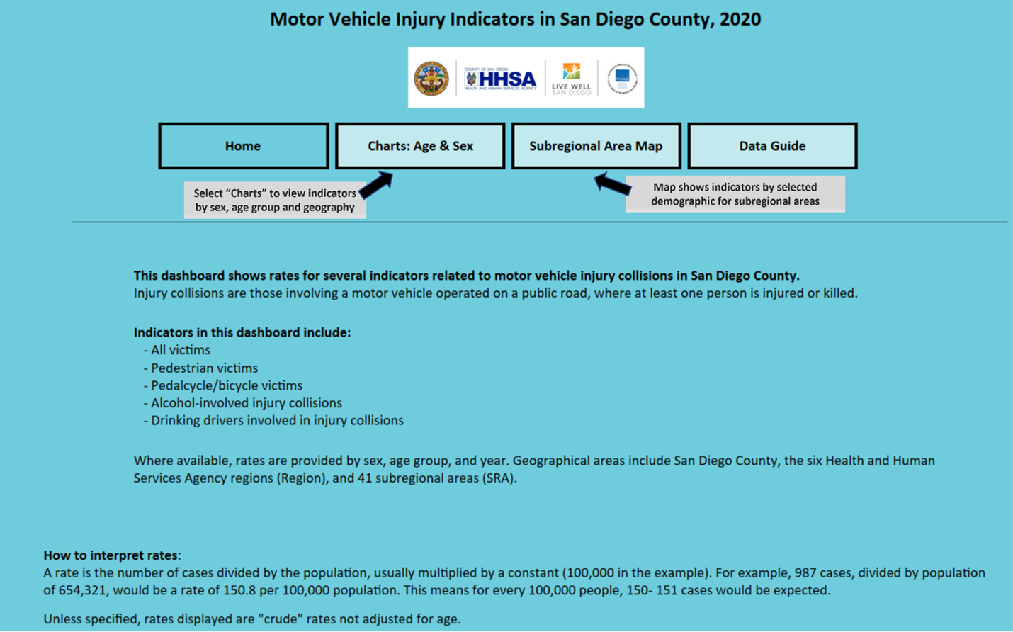 Injury collisions are those involving a motor vehicle operated on a public road, where at least one person is injured or killed. These dashboards show the rates of several injury indicators related to motor vehicle collisions in San Diego County for 2020. Where available, counts and rates are provided by sex, age group, and geography.